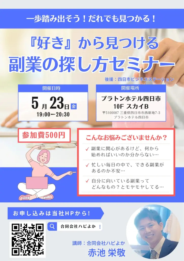 セミナーのお知らせです。副業に興味はあるけど、何をして良いか分からない。副業といってもアルバイト・パートを掛け持ちするのは違うとお考えのあなたのヒントになるセミナーが開催されます。